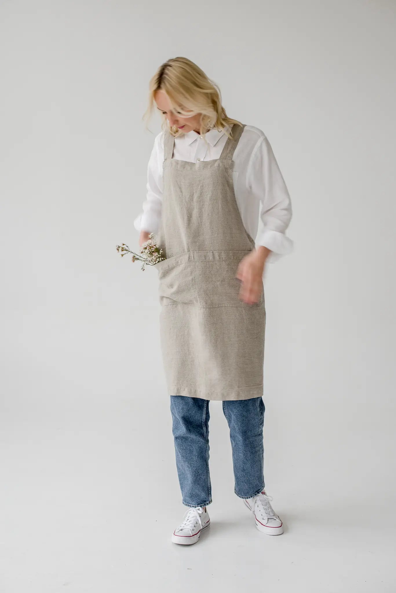 pendant que vous cuisinez, bricolez ou rangez grâce à notre robe tablier en lin polyvalent. Ses deux larges bretelles entrecroisées à l'arrière vous permettent de travailler avec style. Pour le côté pratique, deux grandes poches à l'avant. Long jusqu'aux genoux, notre tablier japonais vous laisse toute votre liberté de mouvement. Sa texture en 100% lin vous garantit également un confort optimal: de quoi rendre vos activités créatives encore plus agréables!